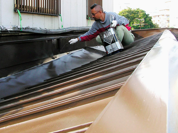今回ご紹介させていただきます工事は【瓦棒葺き屋根】と呼ばれる工法で、カラー鉄板を使用しております。元来は焼き付き塗装を施しておりますが、材料表面が【チョーキング(白亜化現象)】を起こし粉が吹いた様になっているものは、既に塗膜の耐用年数は過ぎています。このまま更に放置しますと錆が発生し腐食→穴が開いてしまいます。穴が開いた時点で修繕費は塗装の倍以上のコストとなりますので、何でも予防の方が安く付く訳ですね。